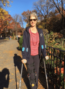 On September 13, 2016, I jumped on my bike at 9:45am racing to my 10:00am yoga class having left my house clearly 15 minutes late. I was barreling down the street on my red folding bike I affectionately call Rocket, when my sweet bike hit a pothole. I went flying through the air landing on the pavement hitting my shin with the force of my momentum as well as my body weight. As a result of the accident, I shattered the top of my tibia, tore my ACL and PCL and split my tibia down the middle. Ouch! Here I was lying on the ground on my own street a half a block from my house. I had done the same bike ride thousands of times before. This time my life was totally turned upside down.