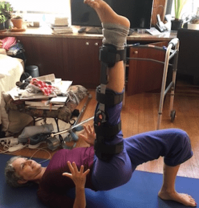 I got rid of the chair in front of my yoga classes. I can sit on the floor now. My students are amazed at my progress. I am profoundly grateful to my own spirit for not giving up, to all my teachers, to my students, friends and family who supported me. To the yoga community who came together to support me through this trauma and recovery. Every day I remember that a year ago I couldn’t walk. A year ago, I was using a walker to get to the bathroom and back and was sleeping on my sofa. A year ago I did not know that I would be here today. A year ago I had faith that I would heal.